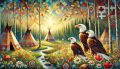 Dreamy Autumn Riverside in Cubist Style with Indigenous Canoe Art