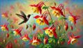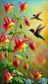 Vivid Depiction of Hummingbirds and Wild Columbine in a Colorful Impressionist Painting
