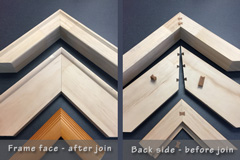 You should have 4 or more separate frame pieces - a singular piece is otherwise known as a moulding. The Hoffman Routing machine creates a unique cut or keyway into the edge of the chosen moulding material. This key way will allow you to join two frame mouldings together by inserting a key into this cut out area. Dovetail Keyways (slots) are routed in all mitered ends. The joining system we use for these frames are called Hoffman Dovetail Keys. These keys are inserted to join the frame mouldings together, creating a tight and perfectly aligned joint. The Keys are a bow tie shape and they come in different sizes depending on the frame, please note we will send you the correct key for your frame. To assemble your frame you will need your keys, hammer and we always recommend good quality wood glue. We may include screws and four flat corner braces for your frame if the frame is particularly large and requires additional support, for which you will also need a screwdriver.