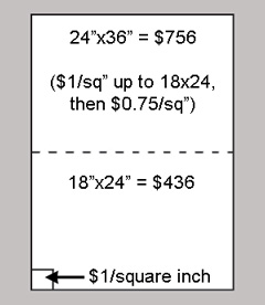 Once you've settled on, say, $1/square inch, you may want to determine a cap for that price. For example, you charge $1/square inch for artwork up to 18x24" ($432), then additional square inches are $0.75/square inch ($756 for a 24x36").