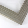 This decorative 1 1/4 " frame imitates the natural bark markings of a birch tree. Cream white paint is distressed in vertical lines, and along the face edge, to reveal a brown grey finish underneath. The profile is solid cream white and features a smooth indent all the way around.